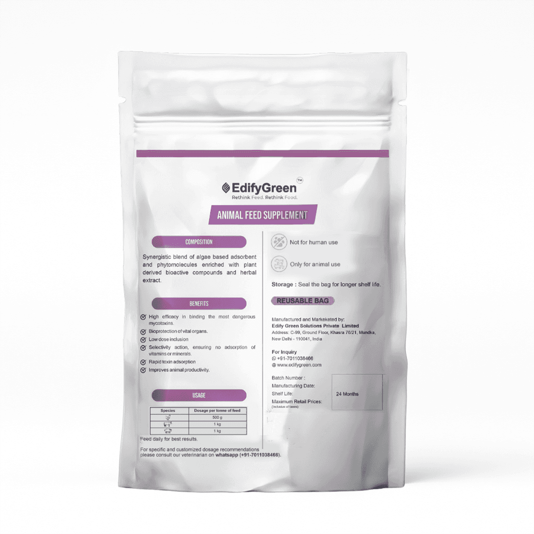 It supports the animal’s natural ability to manage feed-related toxins through a triple-action approach i.e. binding, adsorption, and biological detoxification with postbiotic support.
